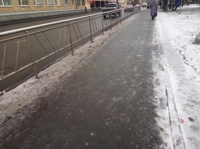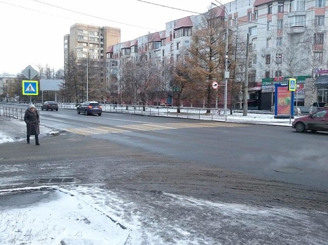 Ситуация на центральных дорогах города несколько лучше — снег не идёт и от колёс автомобилей наледь естественным образом превращается в кашу. Отметим, что дороги в этом году Плесецкое дорожное управление будет посыпать соляной смесью (т.е. снег будет растапливаться), а тротуары — песком. Ни того ни другого сегодня мы не увидели. Вот по такой гладкой поверхности ходят люди.