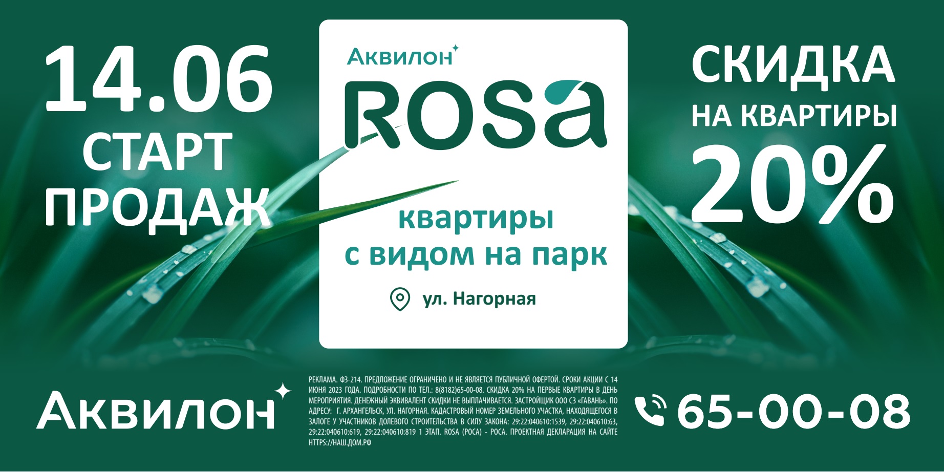 ФЗ-214. Предложение ограниченно и не является публичной офертой. Сроки акции с 14 июня 2023 года. Подробности по тел.: 8(8182) 65-00-8. Скидка 20% на первые квартиры в день мероприятия. Денежный эквивалент скидки не выплачивается. Застройщик ООО СЗ «Гавань». По адресу: г. Архангельск, ул. Нагорная. Кадастровый номер земельного участка, находящегося в залоге у участников долевого строительства в силу закона: 29:22:040610:1539, 29:22:040610:63, 29:22:040610:619, 29:22:040610:819