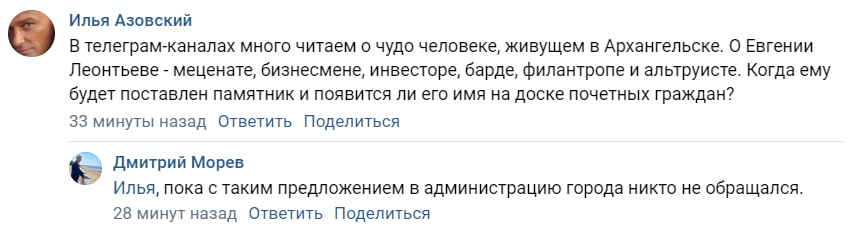 Отдельной строкой посреди бесчисленного количества жалоб от беспокойных северян встал вопрос жителя города Архангельска Ильи Азовского о том, когда в региональном центре воздвигнут памятник прославленному предпринимателю — Евгению Леонтьеву, и появится ли его имя на доске почётных граждан города?