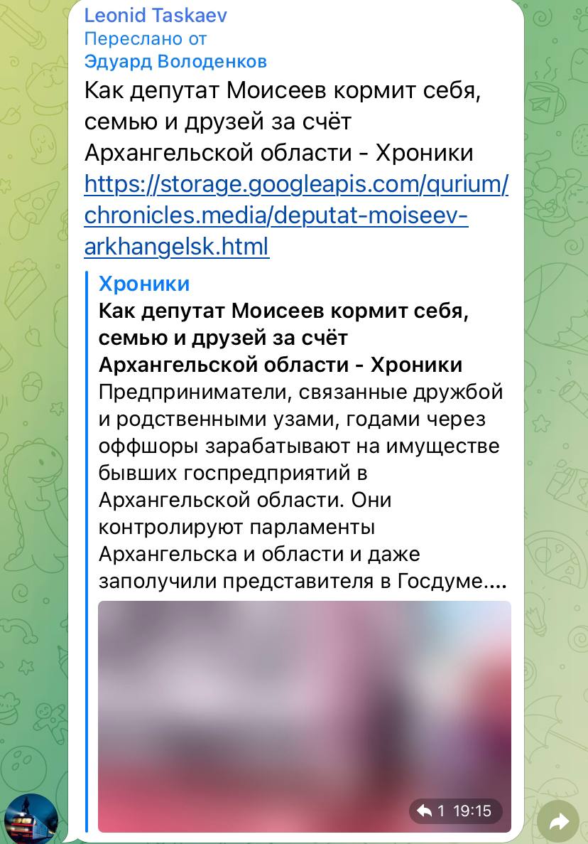 Моисеев — это тоже депутат Архоблсобрания. На Моисеева недавно вылили ушат компромата — целый фильм с обвинениями в коррупции, захвате собственности, торговле бывшим общенародным имуществом, счетах в панамских офшорах. В фильме-расследовании фигурируют и коллеги Моисеева по бизнесу — Климов, Юрков, Бохан.