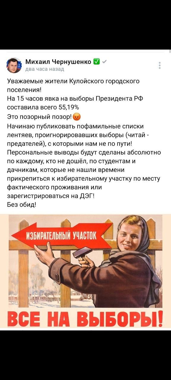 Чернушенко назвал «позорным позором» явку в 55%, а не явившихся на участки — «предателями, с которыми нам не по пути». Более того, он пообещал опубликовать имена тех, кто не пожелал отдавать свой голос. В конце чиновник попросил не обижаться на него.