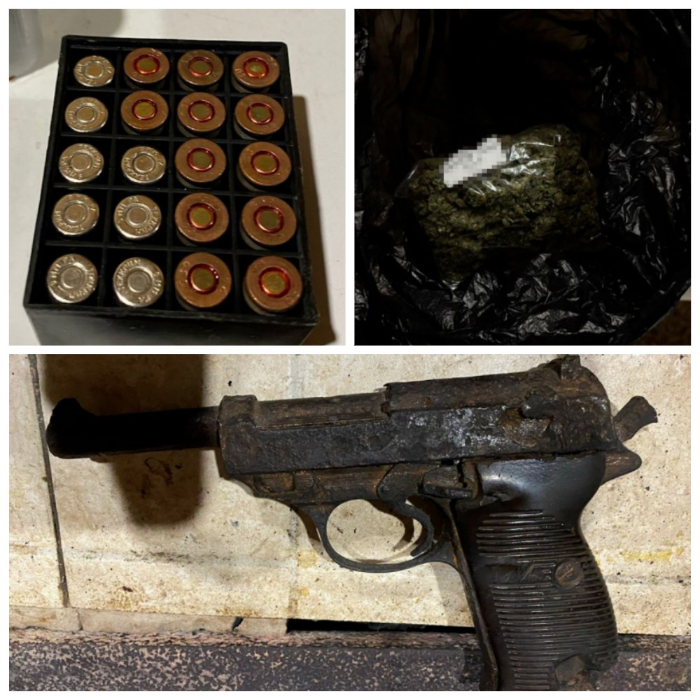 Мужчина был задержан полицейскими при силовой поддержке бойцов ОМОН Росгвардии. В ходе обследования принадлежащего ему нежилого здания стражи правопорядка изъяли пакет с марихуаной массой порядка 60 граммов, синтетический наркотик, а также 12 патронов калибра 9 мм для огнестрельного оружия и пистолет, похожий на немецкий «Вальтер».