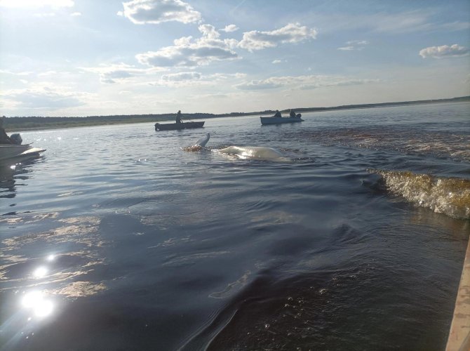 Предполагают, что белуха, как заправский гурман, погналась за рыбкой и заблудилась. Бедняга угодила прямиком на мель в реке; она стонала, изнывая от зноя, лёжа на мелководье и отчаянно поливала себя водичкой собственным хвостом. Местные рыбаки не смогли пройти мимо, и, как настоящие спасатели, семеро поморских богатырей на пяти моторных лодках ринулись полярному дельфину на помощь.