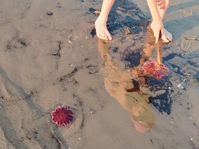 Многие непуганые отдыхающие берут их руками, гладят в воде. А между тем, прикосновение этих хищников к коже человека вызывает ожог, а иногда и анафилактический шок. Поэтому подходить к ним не надо, как и тыкать палкой.