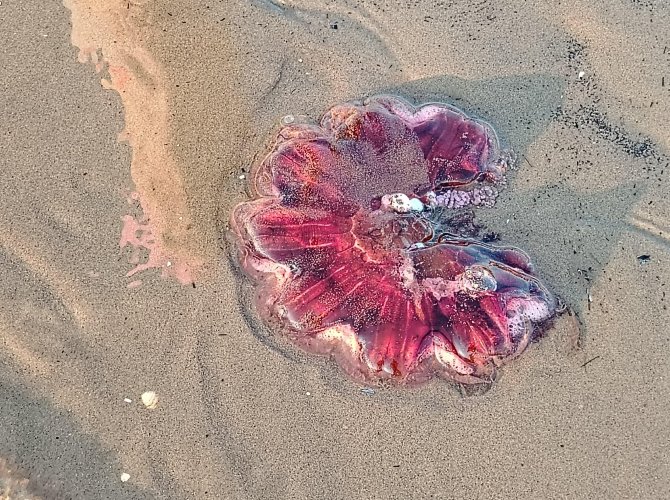 Дело не только в холодной воде, и это несмотря на жару, а из-за массового нашествие медуз. В основном это цианея красно-вишнёвого цвета, а также в меньшем количестве ушастая аурелия.