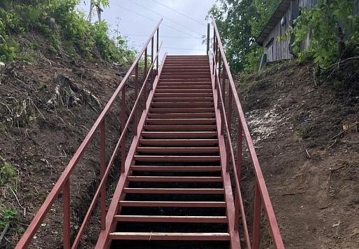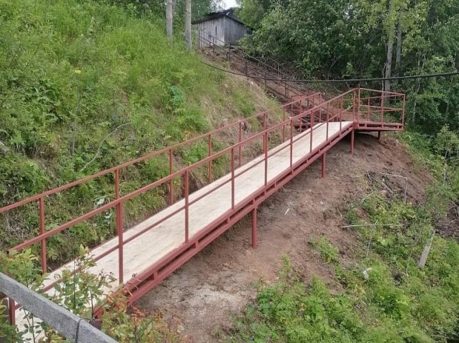 В рамках контракта специалисты подрядной организации разобрали прежнюю деревянную конструкцию подхода с правой стороны реки. Взамен смонтировали новый металлический спуск с перилами и деревянным настилом.