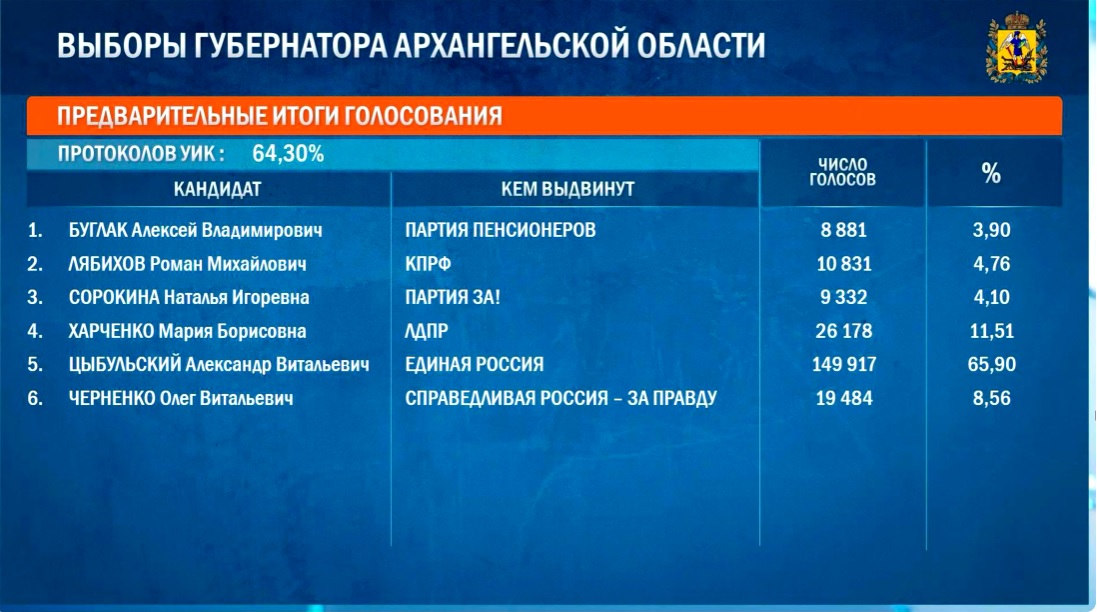 После обработки 64,30% протоколов УИК, действующий губернатор Архангельской области Александр Цыбульский набирает 65,90% голосов (149 917).