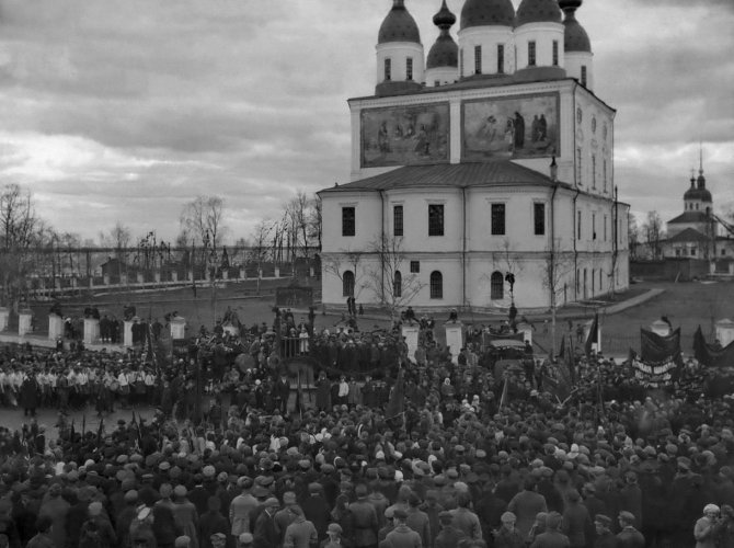 Архангельск, демонстрация на Октябрьской площади у Свято-Троицкого кафедрального собора 1 мая 1925 года.