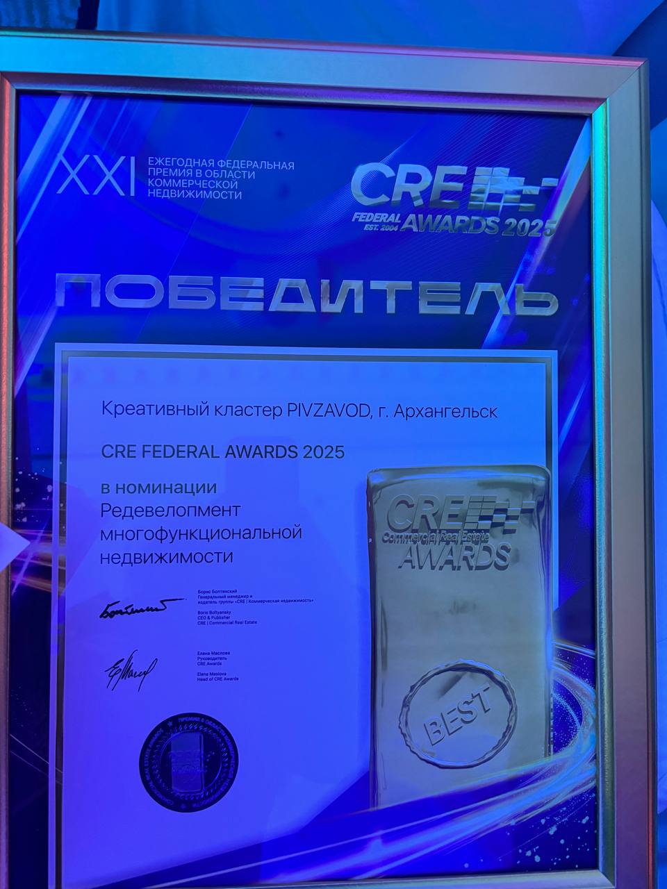 В номинации «Редевелопмент многофункциональной недвижимости» первое место получил реализованный проект воссоздание памятника истории и культуры — пивоваренного завода Суркова в Архангельске, осуществленный Группой «Аквилон».