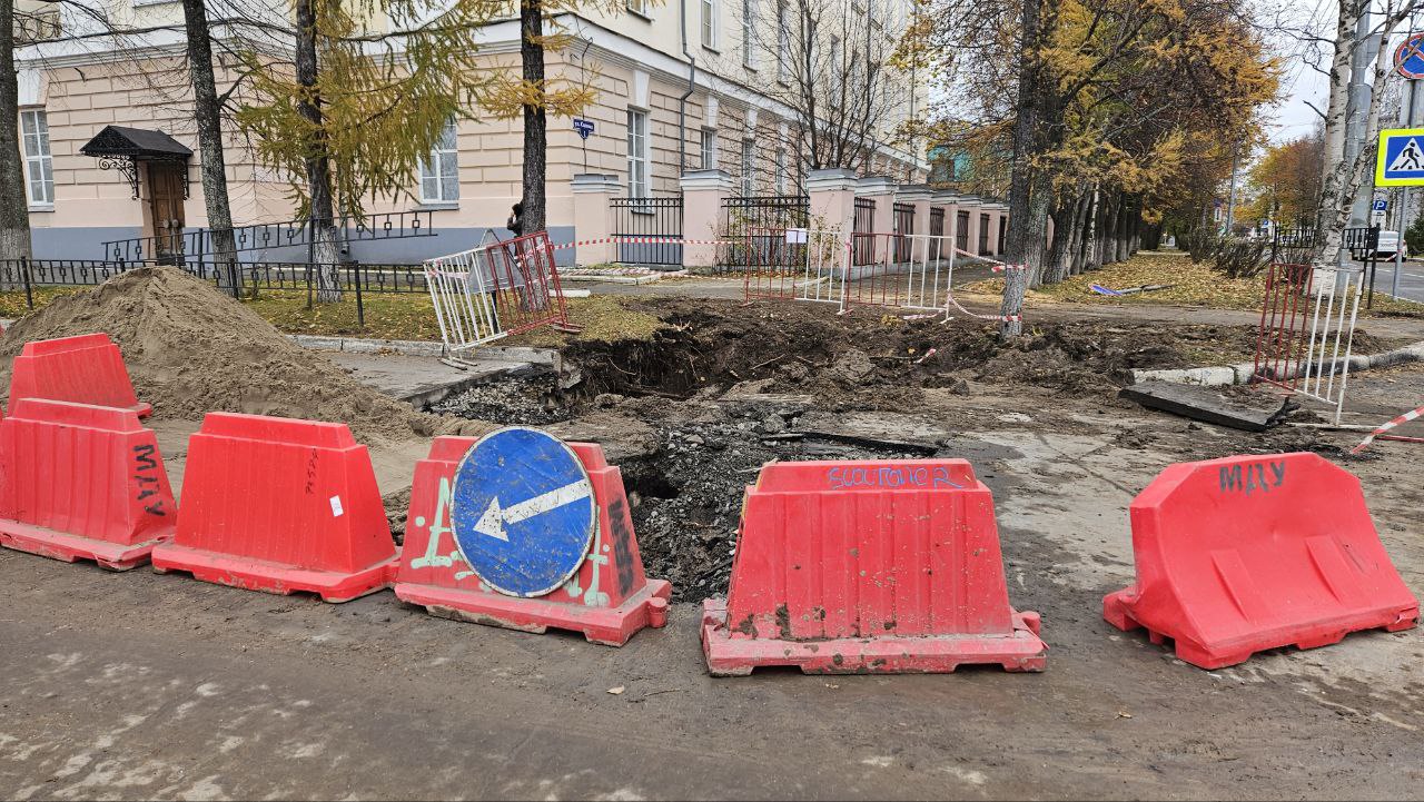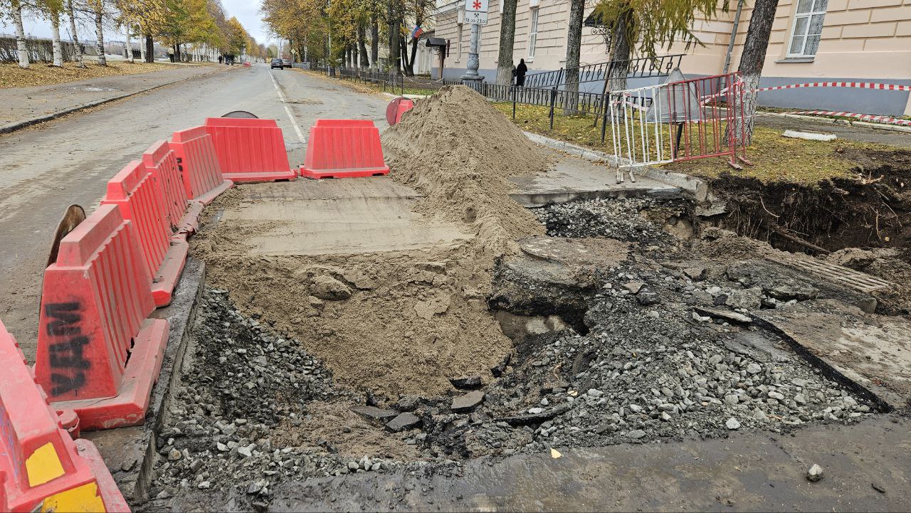 Сейчас место провала обозначено сигнальными лентами, металлическими награждениями и водоналивными барьерами. Часть асфальта срезана, рядом вырыта яма.