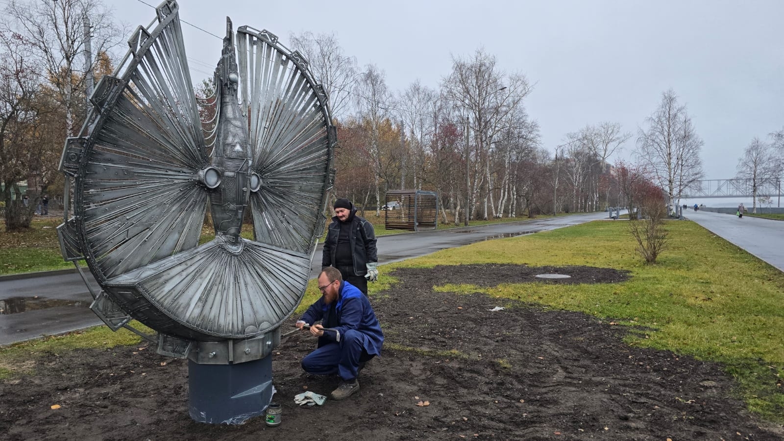 Сегодня осенний Архангельск стал чуточку интереснее — в новом сквере «Добро» на набережной Северной Двины устанавливают внушительного вида скульптуру.