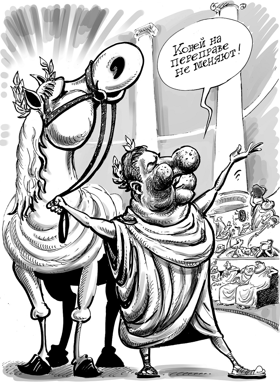 Но на самом деле, всё не так. Приведя коня, Калигула хотел сказать сенаторам то самое, что говорят и в 21-м веке у нас на выборах: КОНЕЙ НА ПЕРЕПРАВЕ НЕ МЕНЯЮТ!