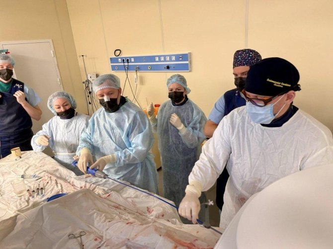 После всех этапов подготовки они приступают к самой операции. Во время вмешательства работает многопрофильная команда — эндоваскулярные хирурги, анестезиологическая бригада, кардиологи, специалисты ЭХО-КГ и операционные сестры.