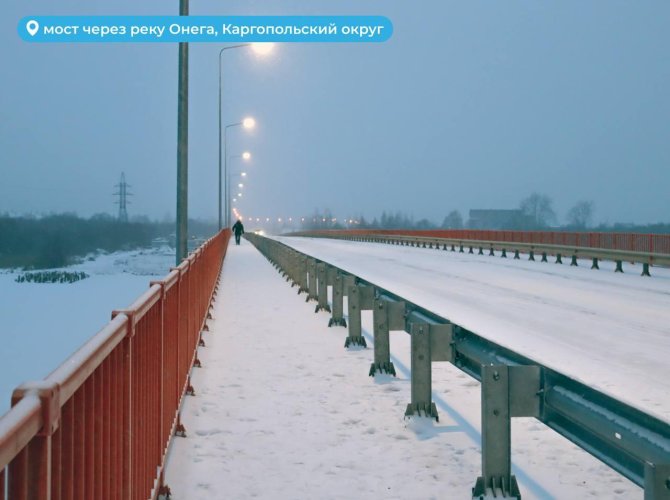 Как сообщает пресс-служба губернатора и правительства Архангельской области, на мосту через Онегу, расположенном на 213-м километре автодороги Долматово — Няндома — Каргополь — Пудож, также выполнен большой комплекс работ: отремонтированы железобетонные опоры, заменены мостовое полотно и пролетное строение, обустроена система водоотвода, проведено укрепление конусов и подходов к мосту, нанесена разметка и установлены дорожные знаки.