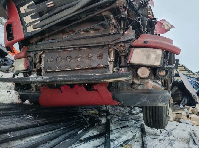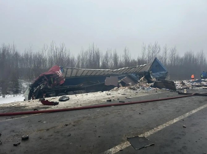 По предварительным данным, водитель «Маза» с полуприцепом пошёл на обгон, столкнулся с «Камазом», который откинуло на «Сканию» с полуприцепом.