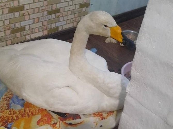 Лебедя забрали домой, обогрели и поселили в теплицу. Сначала он шипел на людей, но вскоре освоился. Его назвали Чупакаброй, сейчас птица идёт на поправку.