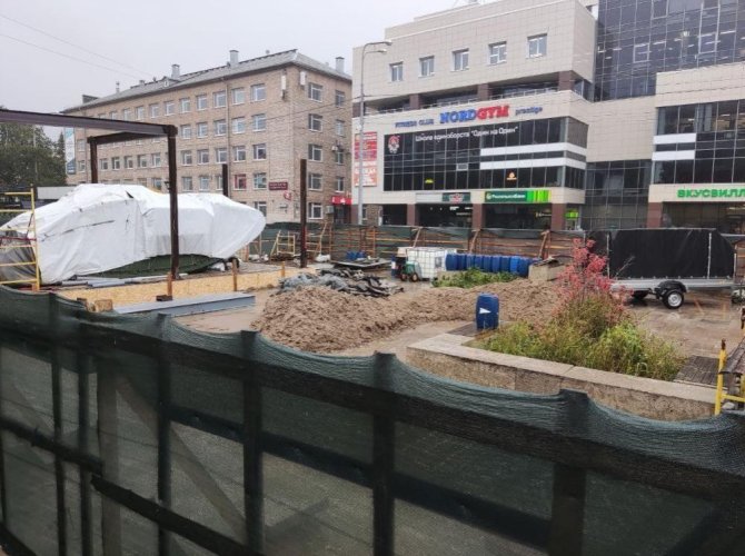 Но, как это часто бывает в наших краях, что-то пошло не так. За всё лето подрядчик — ООО «Веста» — смог демонтировать старый павильон, подвигал танк туда и обратно, залил новое основание и установил несколько опор, которые впоследствии убрали.