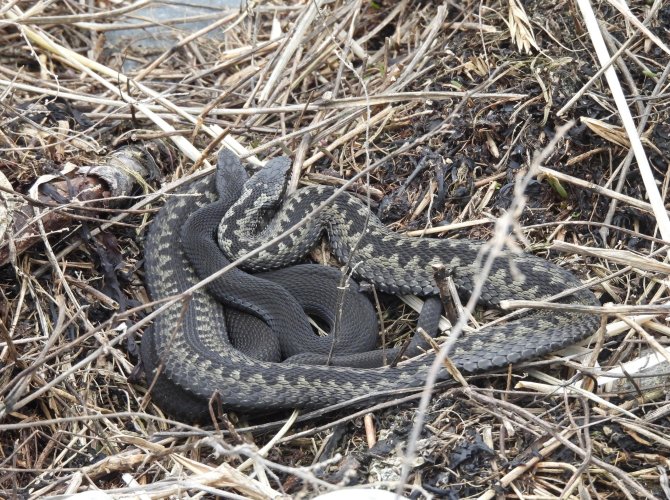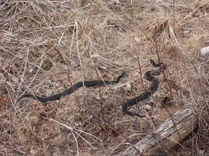 В этом году удалось засвидетельствовать один из самых ранних выходов змей из зимних убежищ — начало апреля. Во время таких весенних выходов змеи иногда сворачиваются в плотный спиральный клубок, а иногда расправляются — становятся широкими и плоскими. Это помогает им согреваться и удерживать нужную температуру. Такое поведение в науке называют «баскингом», оно нужно для терморегуляции.