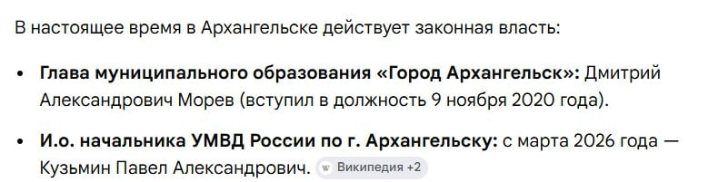 Пытливый разум журналиста задался вопросом: а кто сейчас смотрящий за Архангельском? И журналист спросил ИИ. Так нынче модно и можно…